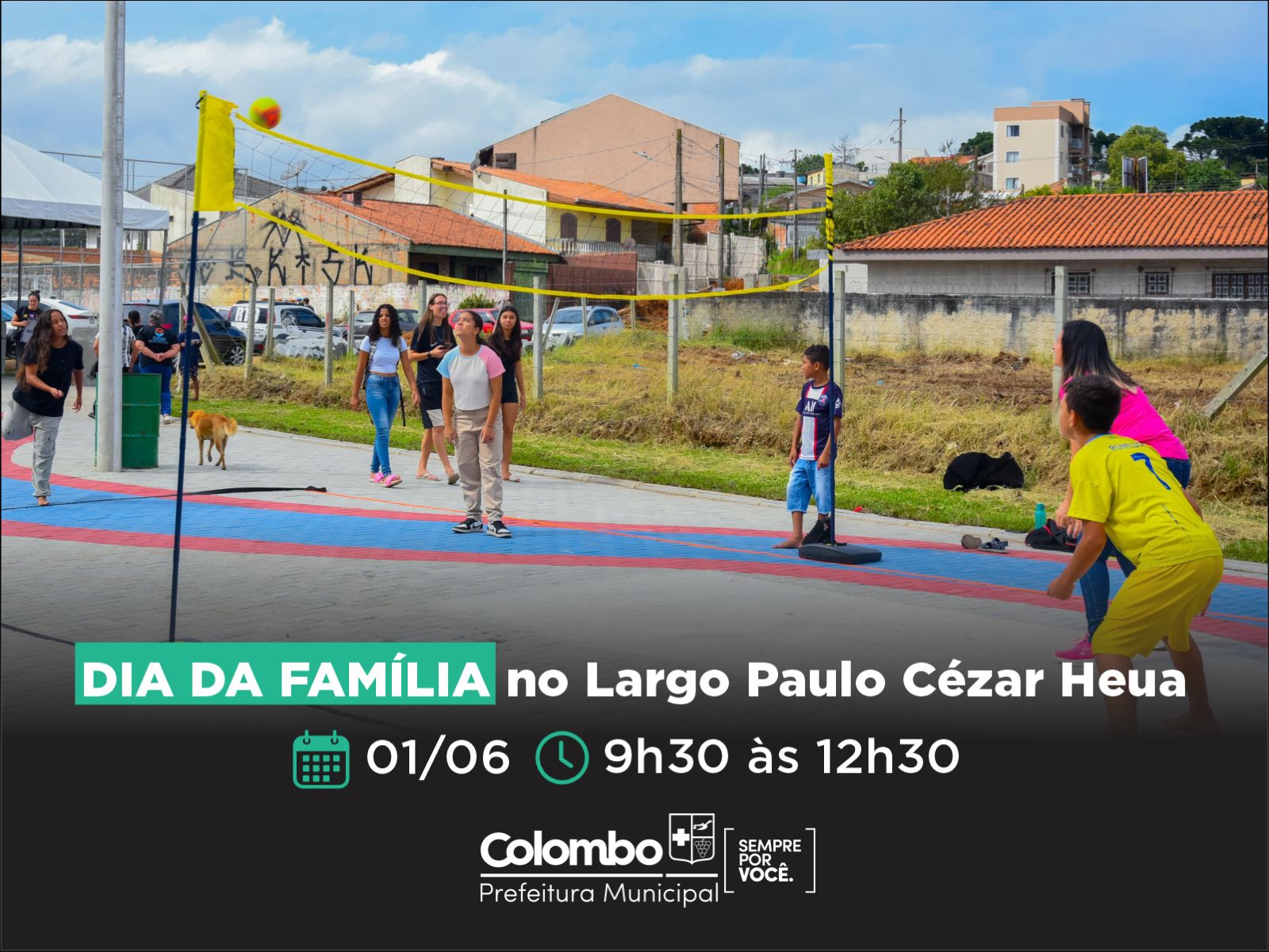 A Prefeitura de Colombo, por meio de sua Secretaria da Mulher, Família e Direitos Humanos e em parceria com as secretarias municipais, promove no dia 01/06 (domingo), das 9h30 às 12h30, a 1ª edição do Dia da Família no Largo Paulo Cezar Heua, no bairro Osasco.