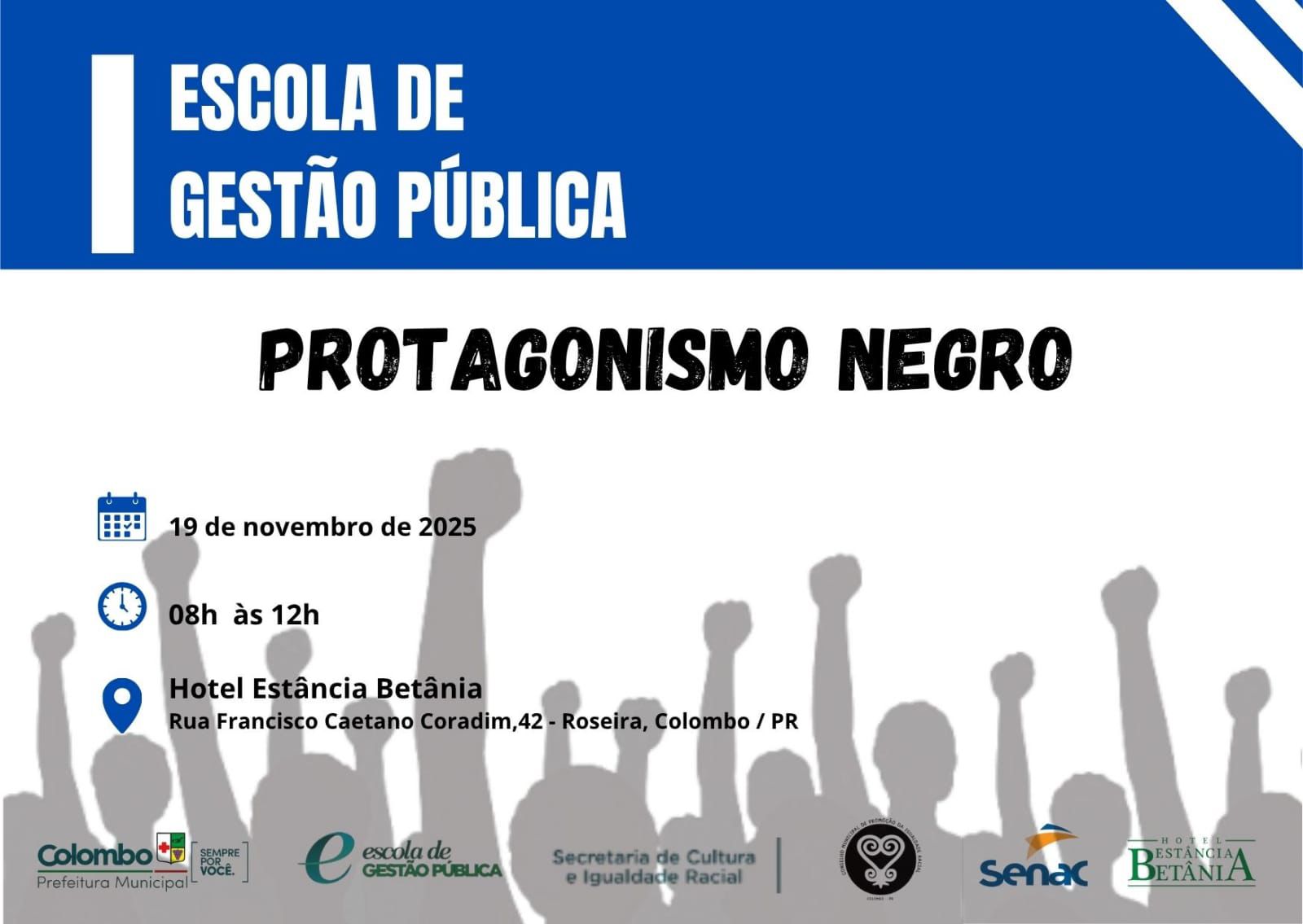 A Prefeitura Municipal de Colombo por meio da Escola de Gestão Pública em parceria com a Secretaria Municipal de Cultura e Igualdade Racial e o Conselho Municipal de Promoção da Igualdade Racial promove no dia 19 de novembro de 2025, o Protagonismo Negro