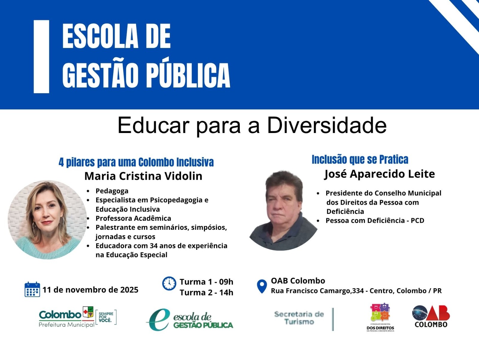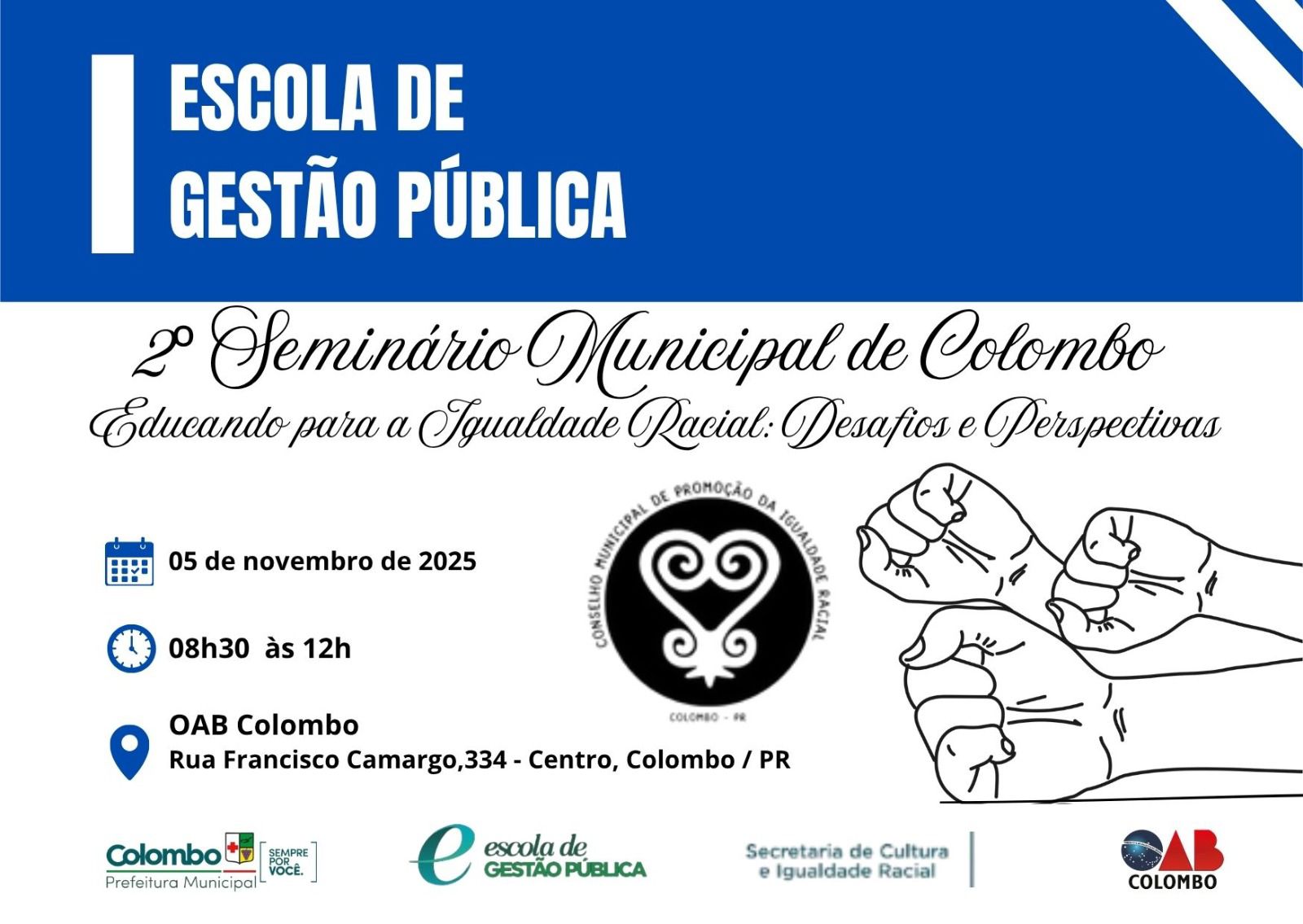 A Prefeitura Municipal de Colombo por meio da Escola de Gestão Pública em parceria com a Secretaria Municipal de Cultura e Igualdade Racial e o Conselho Municipal de Promoção da Igualdade Racial com o apoio da OAB/PR – Subseção Colombo promove no dia 05 de novembro de 2025, o 2º Seminário Municipal de Colombo “Educando para a Igualdade Racial: Desafios e Perspectivas”