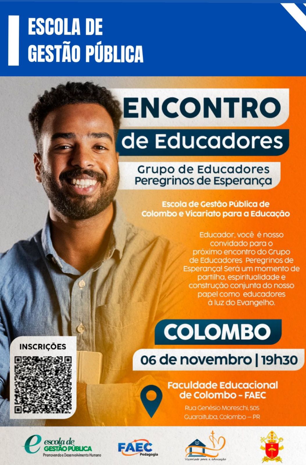 A Escola de Gestão Pública de Colombo, Vicariato para a Educação – Arquidiocese de Curitiba e o curso de Pedagogia da Faculdade FAEC promove dia 06 de novembro de 2025 o Encontro de Educadores