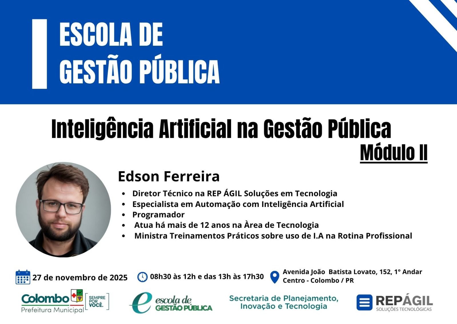 A Secretaria Municipal de Administração por meio da Escola de Gestão Pública em parceria com a Secretaria Municipal de Planejamento, Inovação e Tecnologia promove no dia 27 de novembro de 2025 o curso Inteligência Artificial na Gestão Pública Módulo II