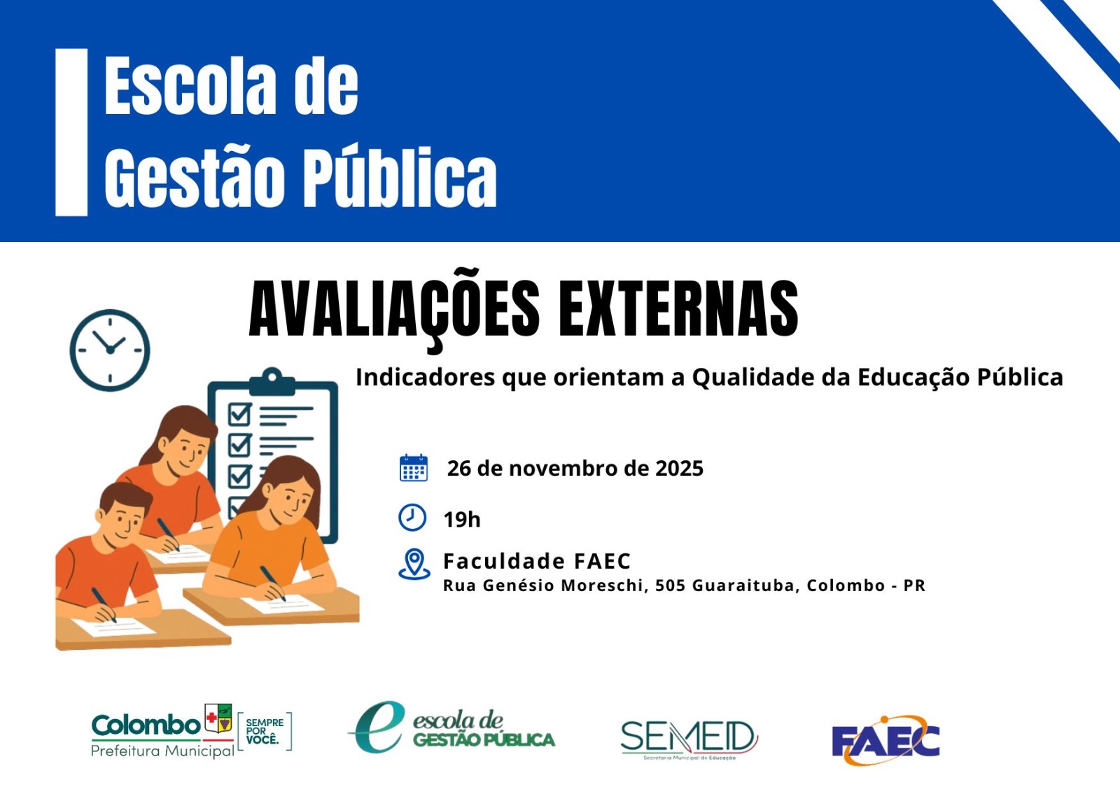 No dia 26 de novembro de 2025 , os acadêmicos do curso de Pedagogia FAEC participarão da formação Avaliações Externas – Indicadores que orientam a Qualidade da Educação Pública , um momento importante para conhecer e entender o processo avaliativo do município.