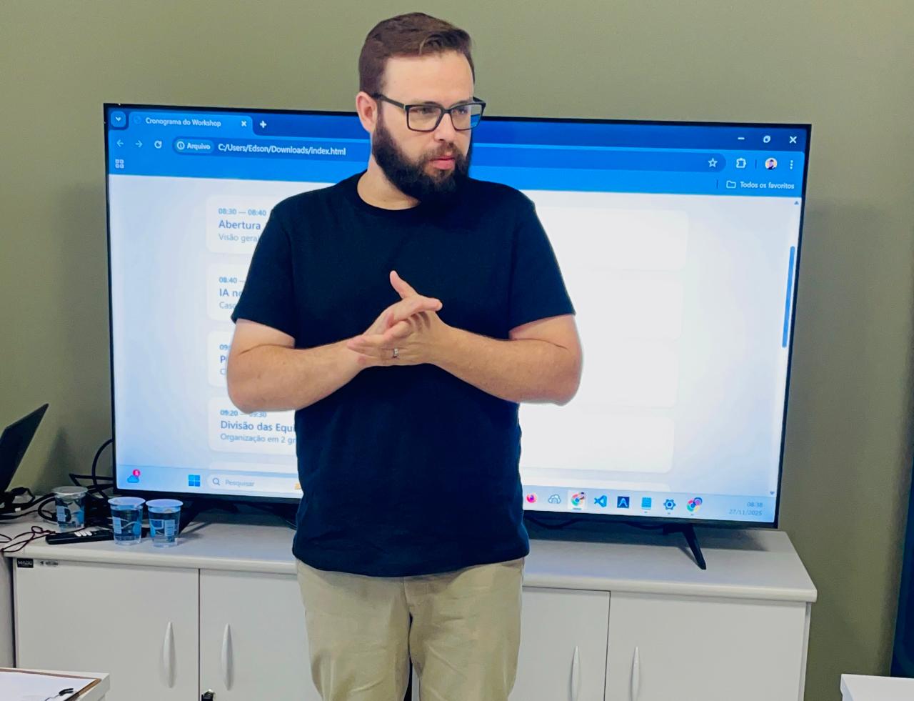O momento formativo foi ministrado por Edson Ferreira, Diretor Técnico na REP ÁGIL Soluções em Tecnologia, especialista em automação com Inteligência Artificial e programador, com mais de 12 anos de atuação na área de tecnologia. O instrutor compartilhou conhecimentos técnicos e práticos, apresentando possibilidades reais de aplicação da Inteligência Artificial na rotina do serviço público.