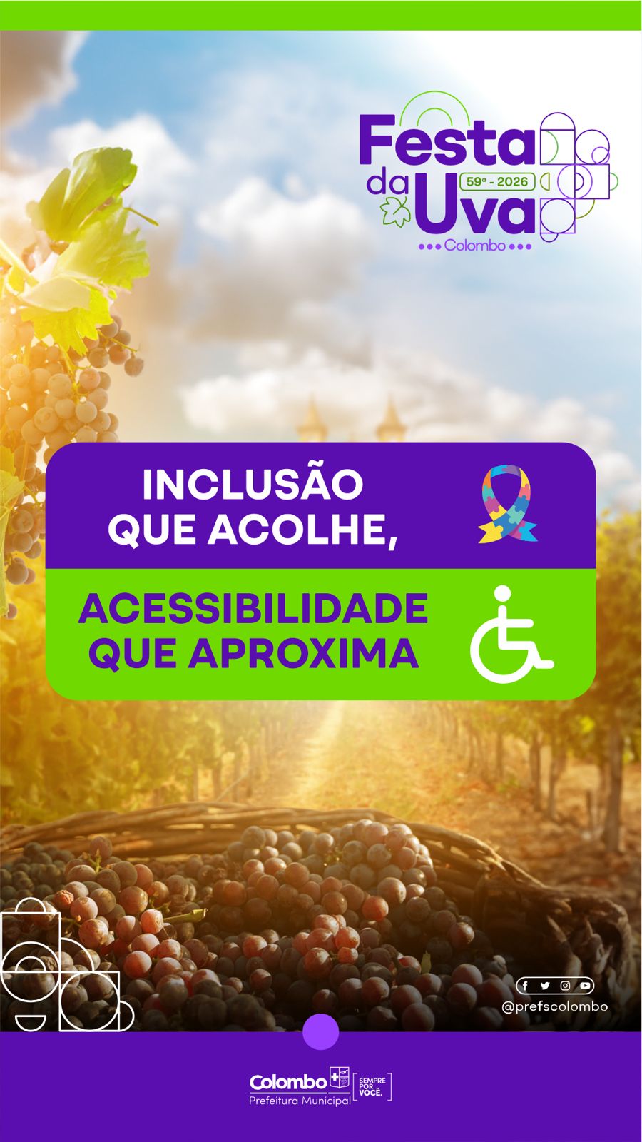 A 59ª Festa da Uva de Colombo chega em 2026 com um olhar especial para a inclusão. Realizado no Parque Municipal da Uva, o evento contará com estrutura acessível, atendimento especializado e uma série de ações voltadas ao acolhimento das pessoas com deficiência (PCDs) e suas famílias.