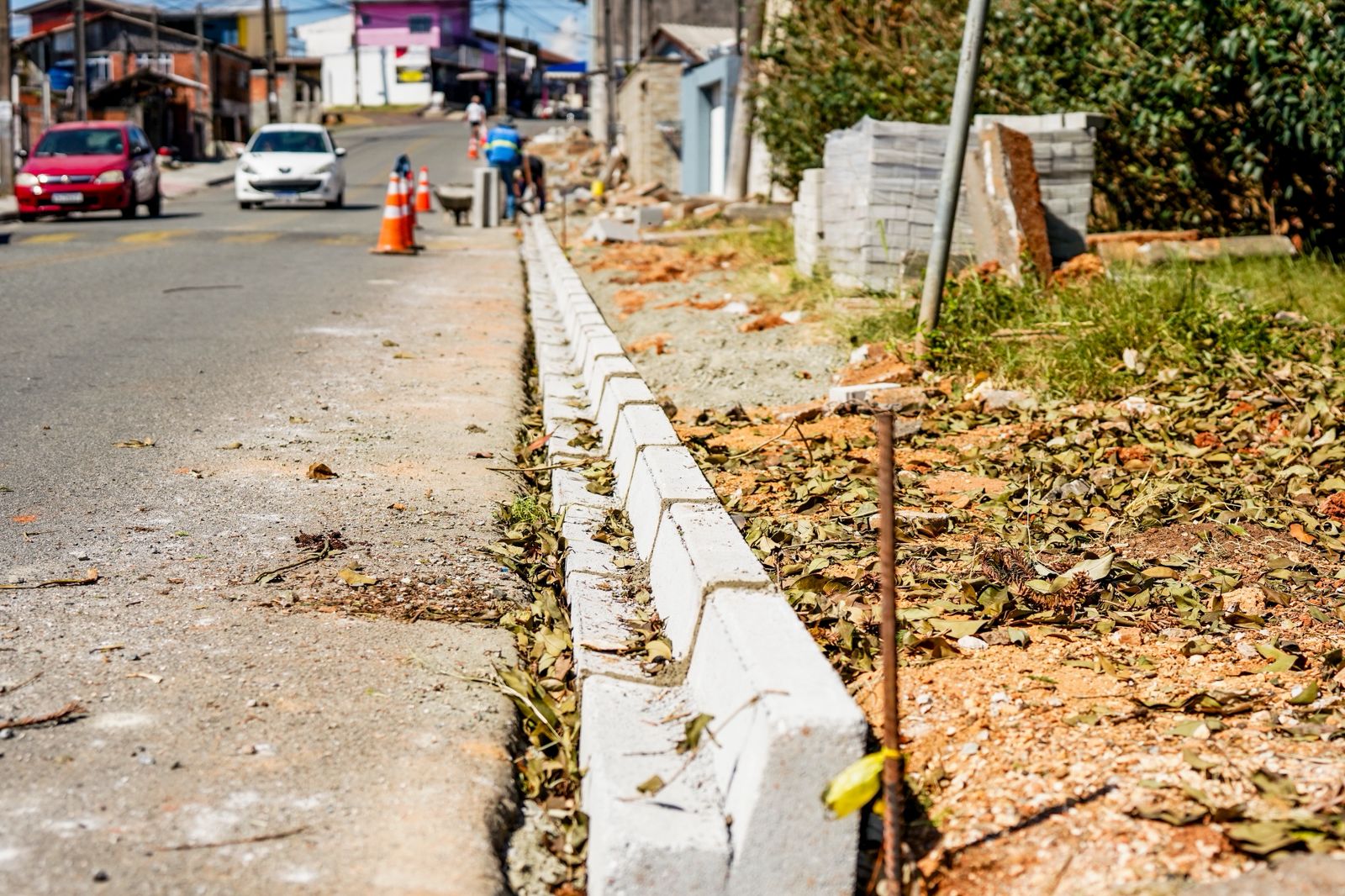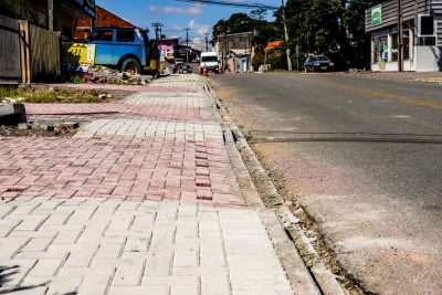 A Prefeitura de Colombo realiza obras de revitalização na Rua Grajaú, no Jardim Monza, com a implantação de calçadas acessíveis e piso tátil.