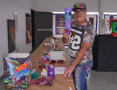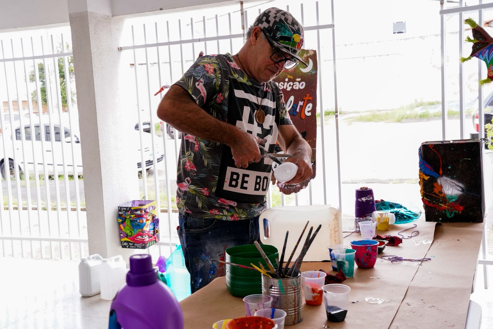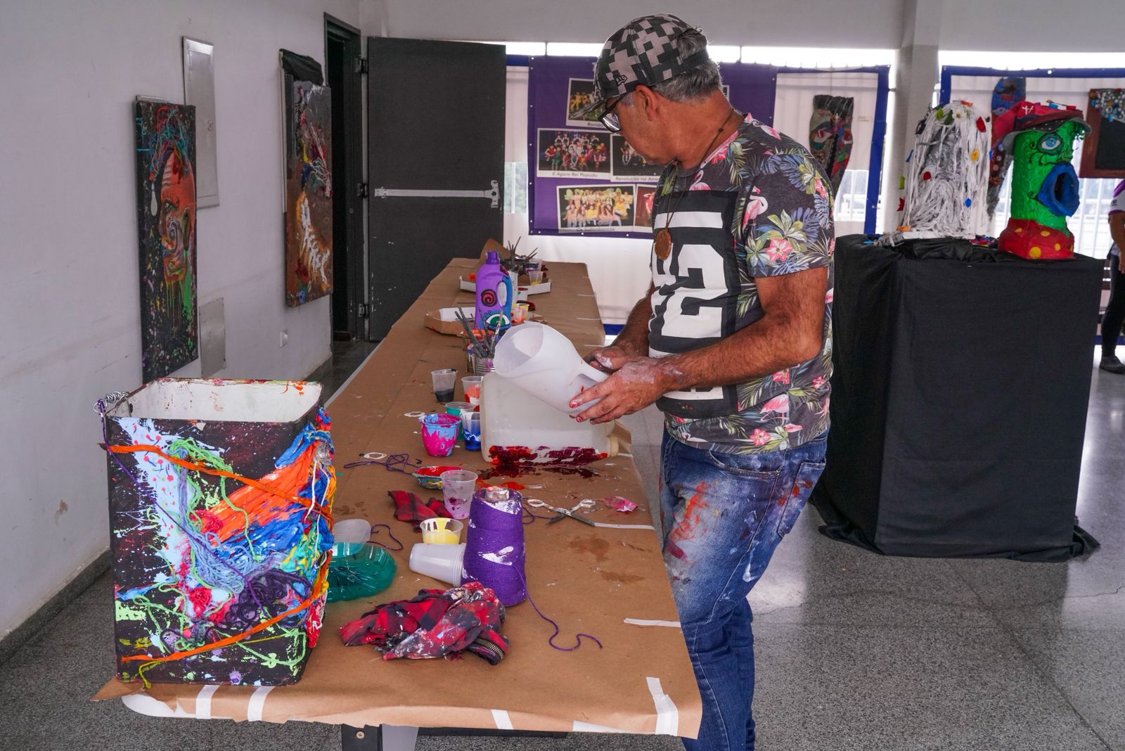 Na parte prática, os participantes desenvolveram atividades de reaproveitamento de materiais recicláveis, transformando resíduos em arte, sob orientação do artista local Rogério Aquino.