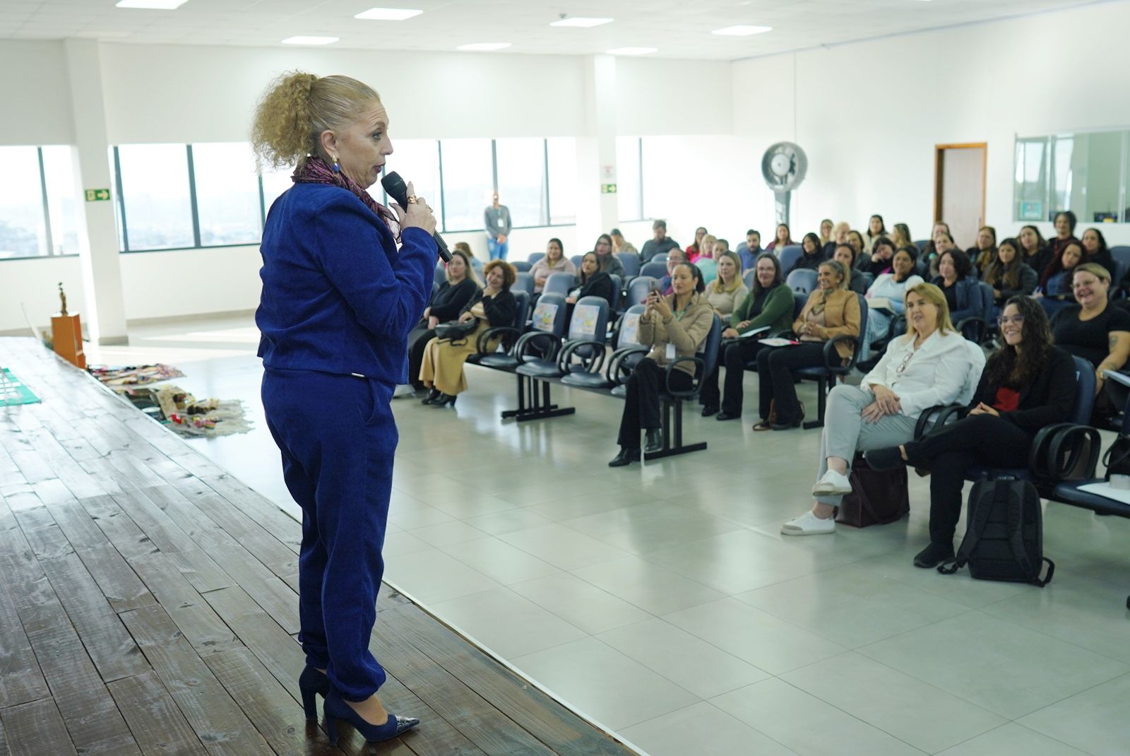 Nesta sexta-feira (16), o auditório da Regional Maracanã recebeu o Seminário do Programa Leitura e Escrita na Educação Infantil (LEEI), reunindo professoras do Infantil 4 e 5 da Rede Municipal de Ensino de Colombo. O encontro foi marcado por momentos de escuta, partilha e valorização do trabalho desenvolvido nas salas de aula da Educação Infantil.